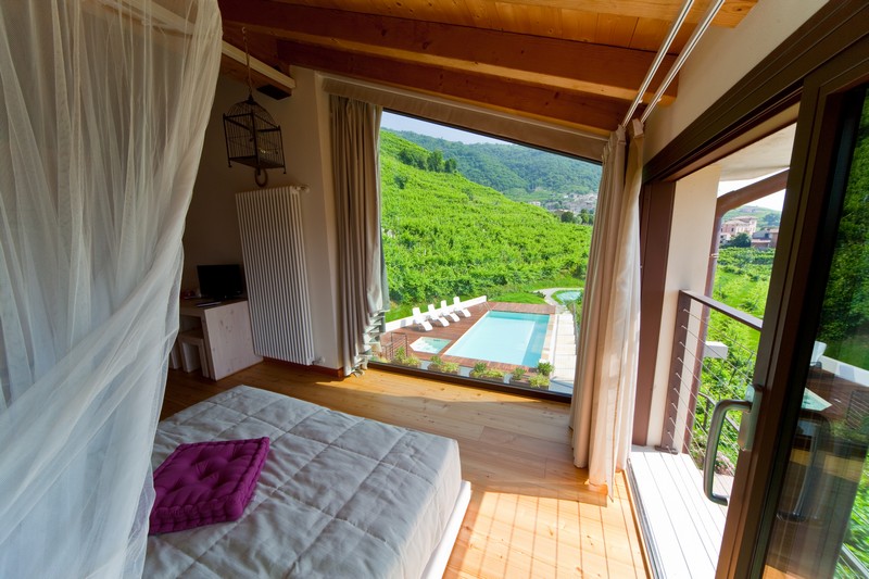 In queste camere, grazie alle enormi vetrate a tutta altezza, ci si â€tuffa†nel panorama, l’occhio corre lontano sulle dolci colline, sugli ordinati filari arrampicati sui versanti, fino alla pianura che si scorge in distanza.