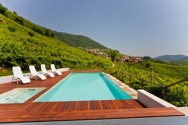Tutte sono collegate con un comodo ascensore al centro benessere che dispone di sauna, bagno turco, cromoterapia, massaggio kneipp sui sassi naturali del fiume Piave, area relax. La PISCINA ESTERNA a sfioro in splendida posizione panoramica, con solarium pavimentato in è a disposizione degli ospiti per un relax totale, lontani dalla confusione e dalla ressa.
